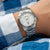 The centerpiece is its finely textured silver dial, a surface that plays with light in the most subtle and sophisticated way. Reminiscent of fresh snowfall or a brushed metallic surface, this delicate texture adds depth and character without ever being ostentatious. This clean backdrop, paired with crisp markers and hands, ensures effortless legibility and a timeless appeal.